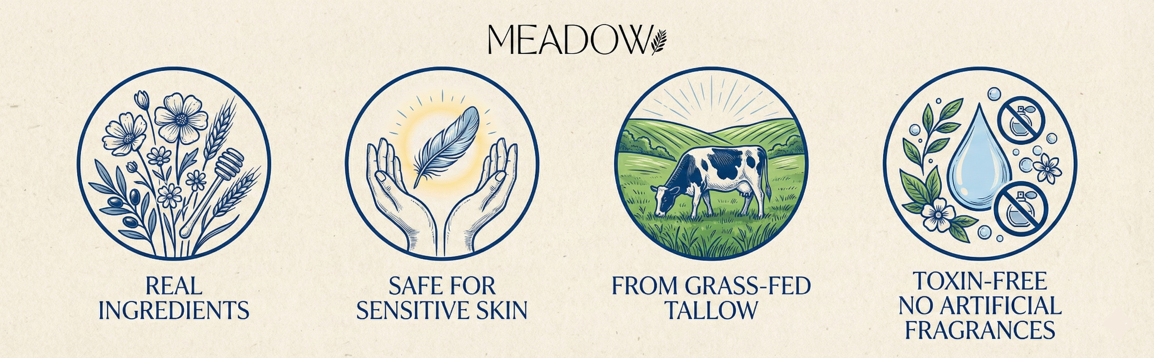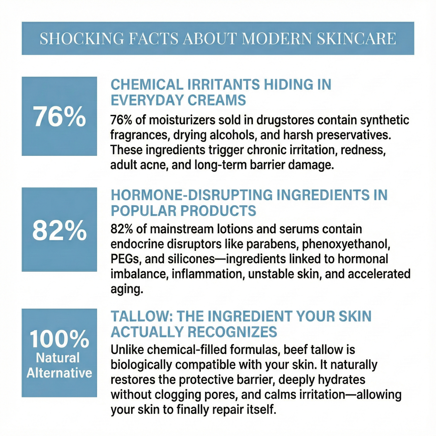 Modern skincare often hides harsh agents that disrupt your skin barrier. Our tallow formula supports your skin's biology instead of fighting it.